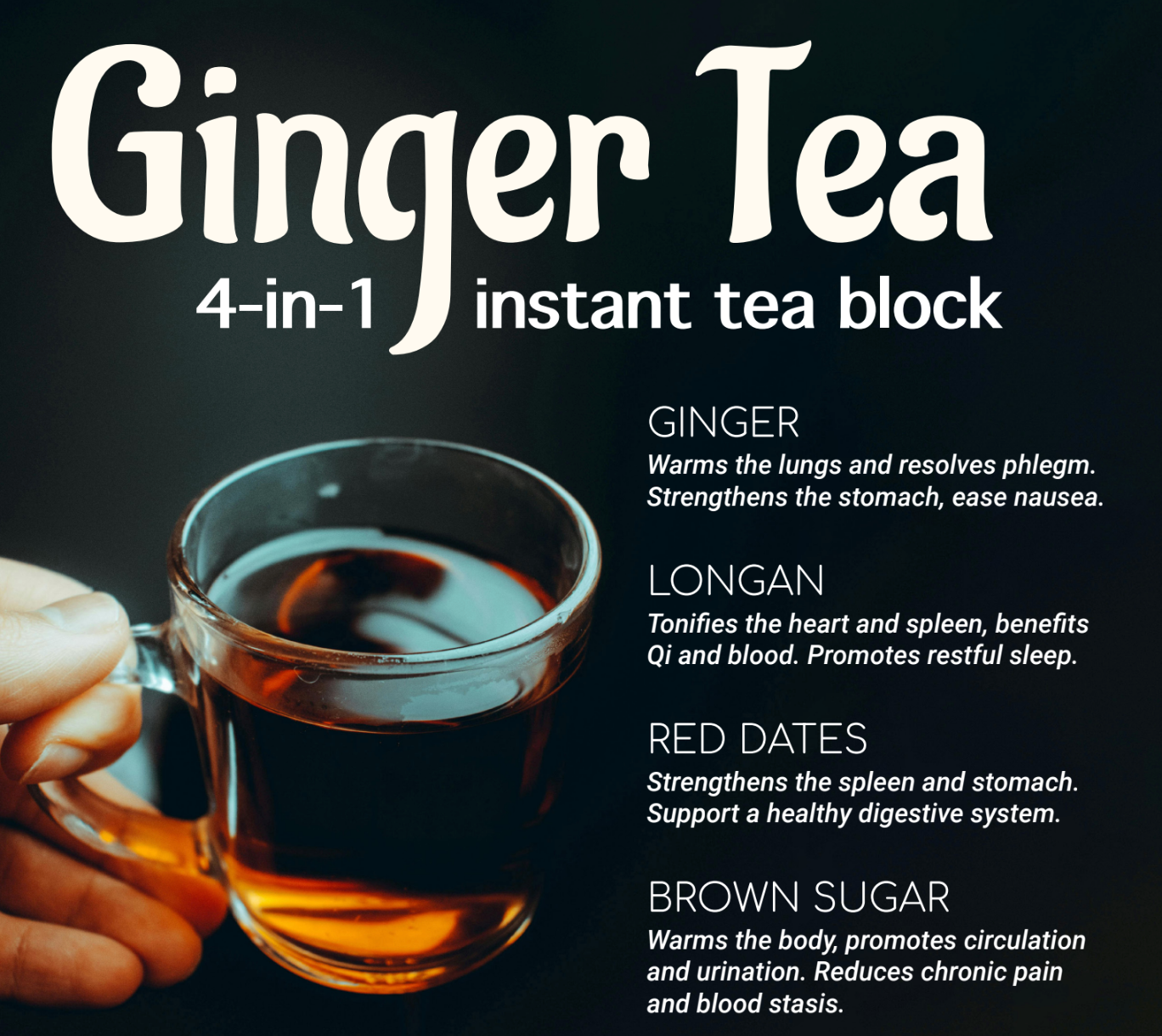 A delightfully warming instant tea, blended with ginger, longan, red dates, and brown sugar. Each ingredient offers multiple benefits: